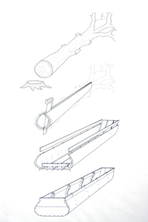Dann sägte man den Einbaum der Länge nach in zwei gleiche Hälften und fügte zwei Bodenplanken und eine schräg nach vorn geneigte Bugplatte zwischen die Hälften.