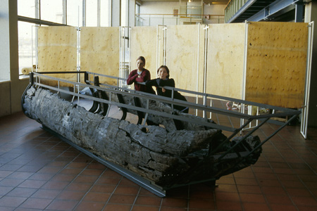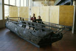 Auf die Seitenschalen dübelte man oben eine Planke - ein Setzbord - um das Fassungsvermögen des Schiffes zu vergrößern. Querliegende Bodenwrangen hielten die Teile zusammen, Spanten stützten Seitenschalen und Setzbord.