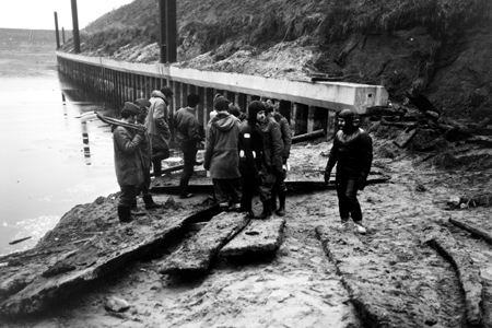 n der Böschung einer Kiesgrube bei Krefeld tauchte im Januar 1973 ein Schiff auf. Es rutschte mit der Böschung ab, löste sich in seine Einzelteile auf und versank im Wasser. Taucher der Bundeswehr befestigten Trossen an den Hölzern, und mit Hilfe eines Lasters zogen und zerrten sie die schweren Einzelteile an Land. Die Kiesgrube war früher ein Altarm des Rheins.