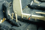 abgeschliffene Dübel. Die Dübellöcher in den Enden der Seitenschalen und der Bodenplanken zeigen eindeutig das Heck des Schiffes an: Hier war das Heckschott angedübelt. Wir halten die Schiffshölzer mit eisernen Spanten in ihrer ursprünglichen Form. Die Winkelleisten deuten an, wie wir den Verlauf des Setzbordes, den Abschluss der Bugplatte und die