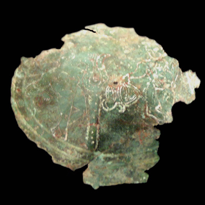 Graviertes Bronzeblech mit Goldeinlage.