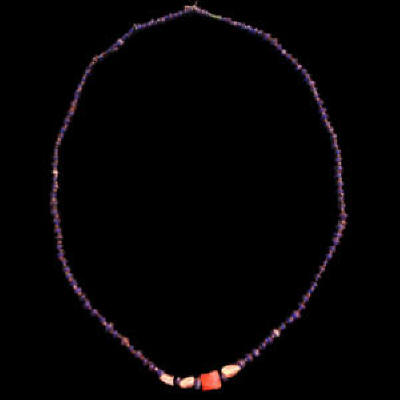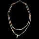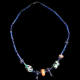 Kette aus blauen Glasperlen, schwarzen Gagatperlen, vier Perlen aus Bergkristall und einer Karneolperle. Gellep Grab 5913 Kette aus kleinen blauen Glasperlen, kleinen goldenen Überfangperlen und Perlen mit blauen und roten Einlagen. Gellep Grab 3918 Kette aus blauen und schwarzen Glasperlen, Augenperlen, schwarzen Delfinanhängern und einer Bernsteinperle. Gellep Gräberfeld