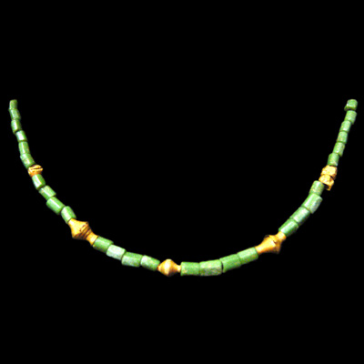 Kette aus Goldblechröhrchen und grünen Glasperlen. Gellep Grab 1043. 4. Jh. n. Chr.
