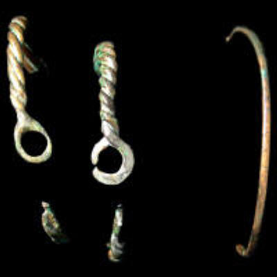 Vier Armringe: einer tordiert, drei aus Bronzeblech mit Kreisaugen und Zick-Zack-Linien verziert. Aus dem Gelleper Hafen. Privatbesitz Ein Armring mit Schlangenkopfenden. Gellep Grab 2972 Ein kleiner tordierter Armring. Aus dem Gelleper Hafen. Privatbesitz Ein kleiner tordierter Armring. Aus dem Gelleper Hafen. Privatbesitz