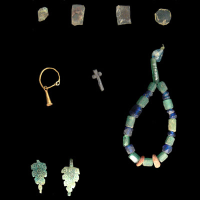 Goldene Herkuleskeule, silberner Phallusanhänger, Glasperlenkette, Weinblattanhänger Goldglas (Diadem). Gellep Grab 4608.