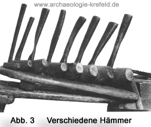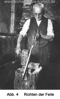 Die Feile wurde dabei auf dem Amboss durch einen endlosen Lederriemen festgehalten, den der vor dem Amboss sitzende Feilenhauer mit beiden Füßen fest anzog. Die Meißel hatten eine breite gehärtete Schneide. Die Hämmer hatten einen kurzen, gekrümmten Stiel und ein Gewicht von 0,25 kg bis 5,2 kg je nachdem ob man eine „feine“ oder „grobe“ Feile herstellen wollte. (Abb. 3) Als Unterlage zum Schutz vor Beschädigung fertig gehauener Feilenflächen, verwendete man dünne Bleiplatten.