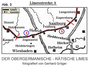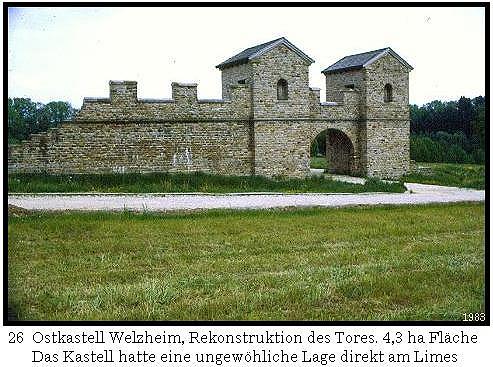 Unter Kaiser Hadrian (117-138) wurde die bis dahin offene Grenzlinie in Obergermanien mit Hilfe einer hölzernen Pfahlreihe (Palisade) geschlossen, so daß ein Übertreten der Grenze nur noch durch die Limestore möglich war. Auf diese Weise konnten die Römer den germanischen Handel leichter kontrollieren und kleinere räuberische Übergriffe verhindern. Später wurde der Limes wehrhafter ausgebaut, doch fehlten auch den unter Antoninus Pius (138-161) errichteten Steintürmen noch Wehrgänge und Geschützplattformen. Größere Angriffe konnten somit nur die im Hinterland stationierten Truppen abwehren.