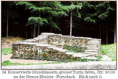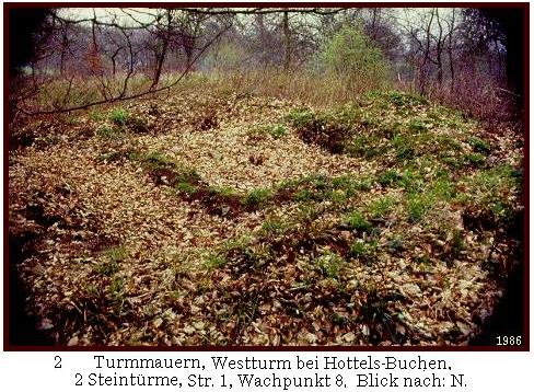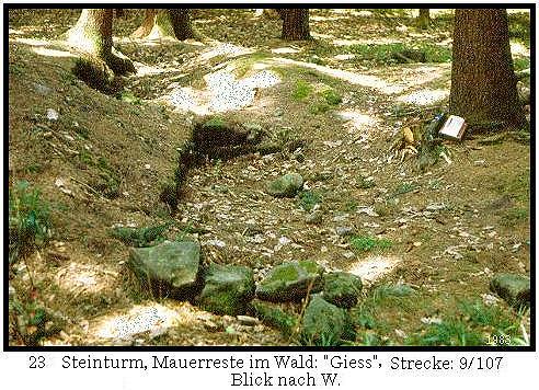 dazwischen liegenden Wachtürmen und einen Graben. In Obergermanien lagen die Wachtürme meist hinter dem Pfahlgraben. In regelmäßigen Abständen gibt es hinter dem Limes die Überreste von Sicherungskastellen unterschiedlicher Größe.