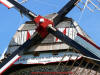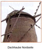 Auf diesem Bild blicken Sie auf die mit Schindeln gedeckte drehbar gelagerte Haube der Mühle mit Schwertbalken. Die Mühlenkappe